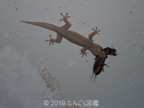 灯火や花に集まった昆虫を捕食する。4~9月に壁や石の隙間に卵を産む。沖縄県内には建材や植木などに紛れ人為的に持ち込まれ、定着した。時期や原産は不明。