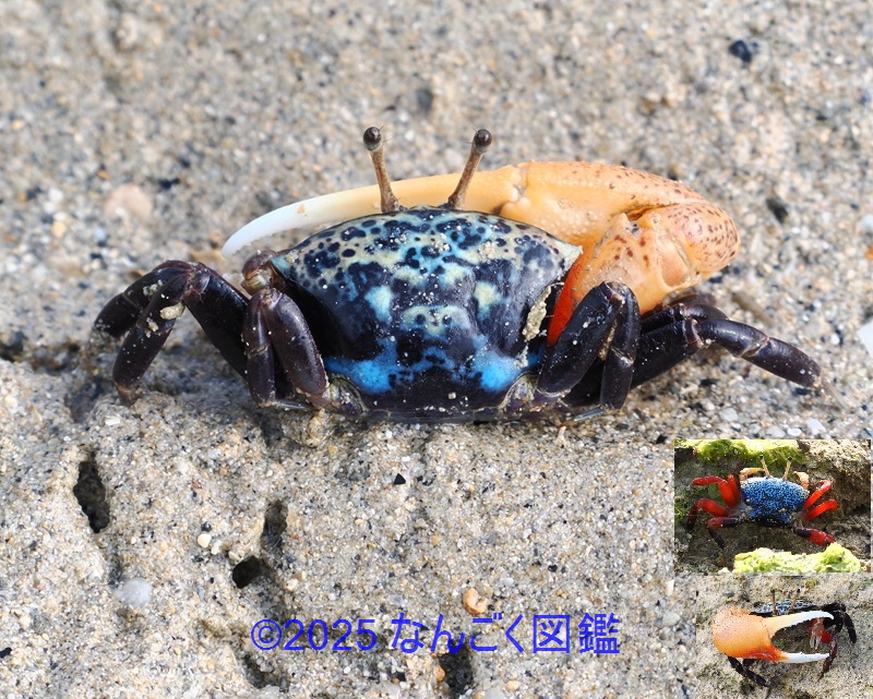 砂礫が溜まった岩礁やマングローブ林、干潟、河口などで見られる。甲は厚みがあり、正方形に近い台形。甲面は瑠璃色で黒色の不規則な斑模様がある。雄の大鉗脚の掌部は橙色で、指部先端では乳白色になる。歩脚は黒褐色だが、基節から指節にかけて赤色となる個体もいる。