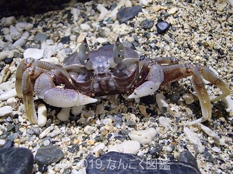 砂浜に穴をほって生活するカニで目の先端に角のような突起があるのが特徴。目の突起は雄は大きく、雌や若い個体では小さい。