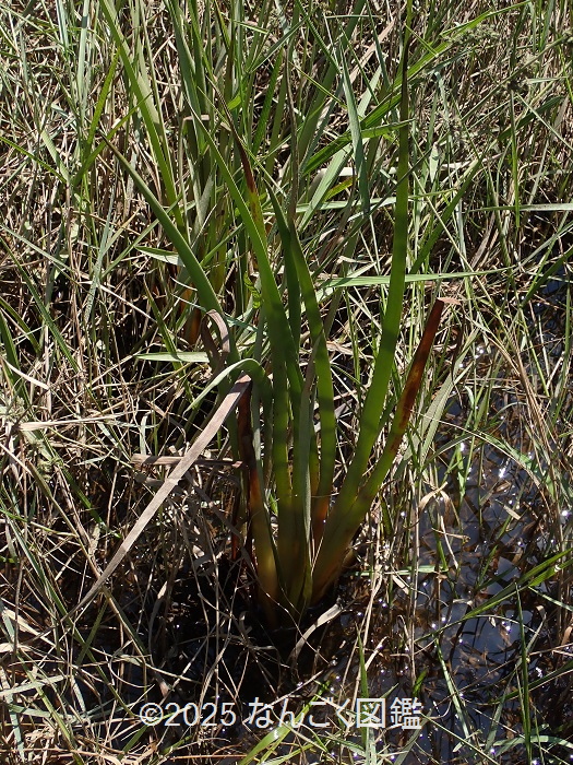 日当たりのよい湿地や畔でやや稀に見られるタヌキアヤメ科の多年草で高さ40〜100cmほどになる。