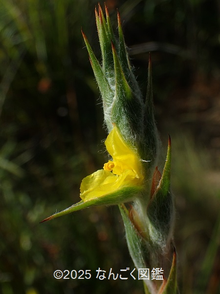 葉は束生し剣状線形で長さ30〜70cm。花茎は葉の間から高く伸び、穂状花序は長さ30〜60cmほどで白い綿毛があり、苞の腋に1〜2個付く。