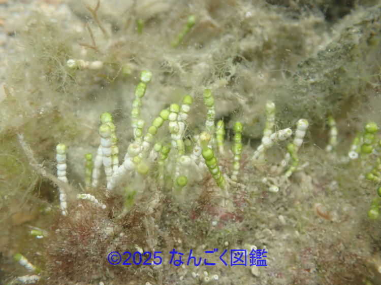 内湾の潮間帯やタイドプールでやや稀に見られる海藻で、転石や死サンゴ上、貝殻や礫上にまとまって生えることが多い。藻体は長さ10〜25mm、団子のような球状部が数珠のように連なり、石灰質を沈着する。先端の球状には白い密毛を有する。