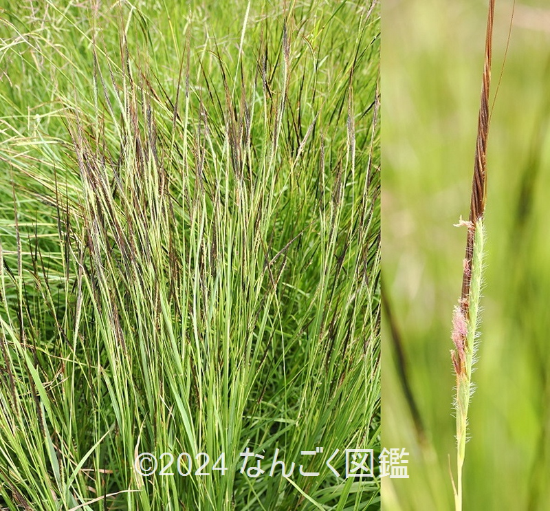 日当たりのよい草地で極々稀に見られるイネ科の多年草。稈は束生し高さ30〜100cm、葉身は披針形で長さ7〜12cm、幅4mm以下で無毛。